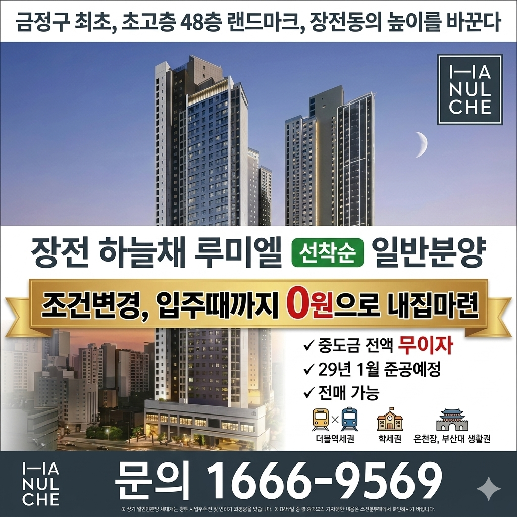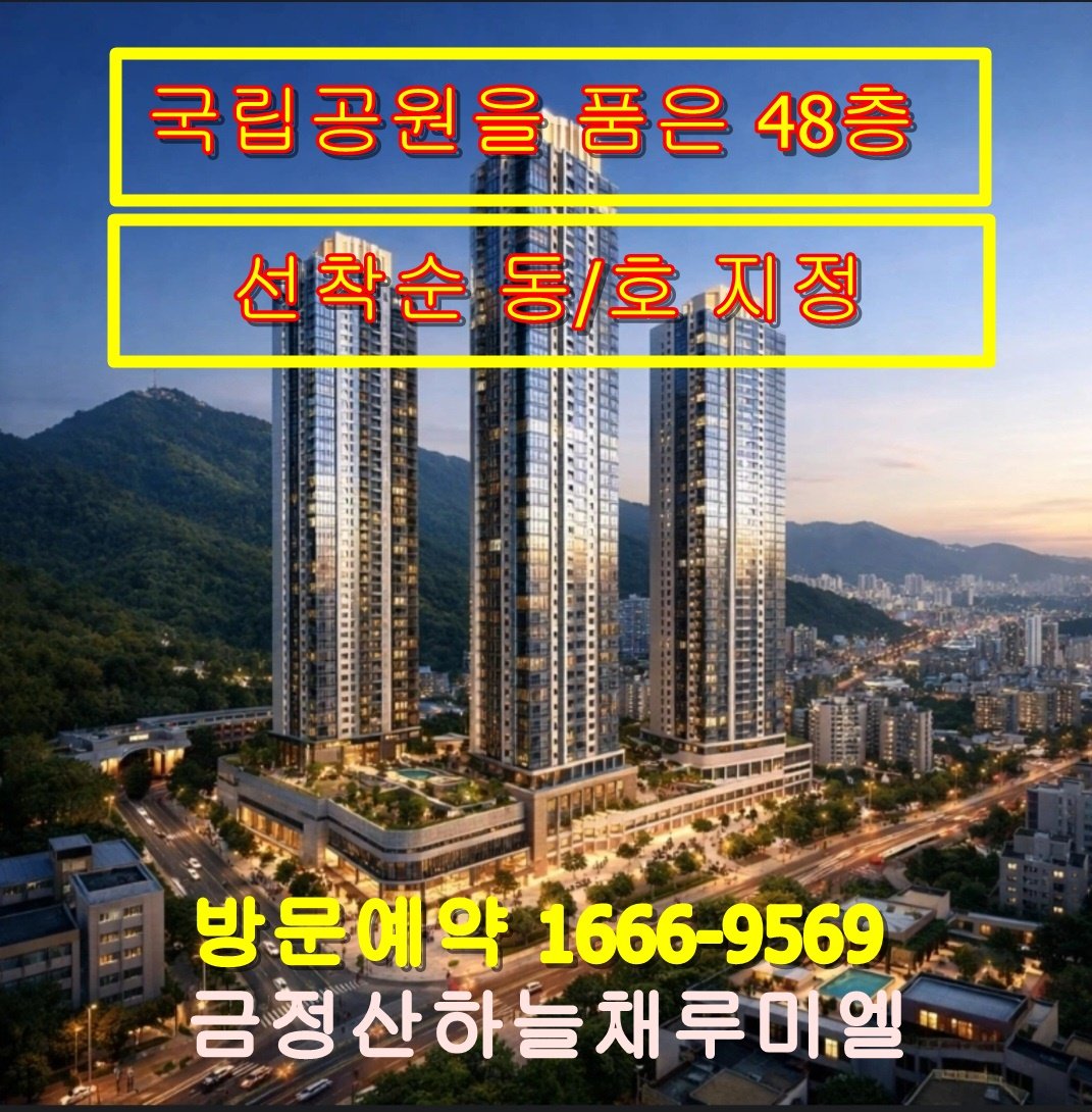 입주시까지 "0" 원 ! 계약 축하금 70세대 한정 금정산을 가득 품은 48층 초고층 라이프 특권 ! 부산 금정구 3년만에 신규 분양 !금정산 하늘채 루미엘 !가장 높은 하늘에서 하늘채가 시작합니다. Welcome To 금정산 하늘채 루미엘 방문예약하기 금정산 하늘채 루미엘 온천장역 도보권으로 이용 가능360도 파노라마 시티뷰와 파크뷰를 누릴수 있는48층 초고층 라이프지하6층 ~지상 48층 압도적인 스케일 랜드마크 하이엔드로 특화된 대형 드레스룸 제공 ! 파격적인 계약 조건 변경 70세대 한정 선착순 계약축하금 5% 입주시까지 “0”원 중도금 무이자, 전매무제한,선착순 동,호 지정 모델하우스 방문 100%예약제 운영되며 담당자 지정 관람방문자 혜택 큰~선물 증정부부 동반 방문시 미니캐리어가방 & 스타벅스쿠폰& 핸드크림세트 계약자 선물: 다이슨 슈퍼 소닉 뉴럴 헤어 드라이기 세트 & 신세계 백화점 상풍권 증정 방문예약 대표번호: 1666-9569 장전동 중앙대로 최고 라이프 !48층 초고층 360도 파노라마 뷰 ! 하이엔드 아파트의 가치를 더하다! PREMIUM TRAFFIC 우수한 역세권 교통라인1호선라인 온천장역 만덕~센텀 IC 지하대심도 개통 후 10분 관통 NATURE 금정산 국립공원을 품은 명품 주거벨트라인 중앙대로 라인과 온천동 내 재개발 사업으로 브랜드 주거타운 형성 LIFE 생활인프라 형성 롯데백화점,롯데마트,홈플러스,광혜병원,대동병원,대형종합병원,금정구청과금정세무서, 롯데시네마,온천천,사적공원 등 EDUCATION 명문학군 동래구 8학군 금빛초, 금정초,도보5분 장전중 동래여고,동래고,중앙여고,대명여고,부산과학고 등 우수한 사교육 학원가 밀집 지역 장전동 중앙대로 맨 앞자리 City뷰와 Park 뷰 라이프를 누리는 미래 부산 프리미엄의 기준이 되는 금정구 금정산 하늘채 루미엘 세대수 0 세대 오피스텔,펜트하우스 ,2 계약면적㎡ 84 , 74,84,106 OUR GALLERY 총세대수 743 아파트 669세대 59A,B㎡,74㎡,84㎡,106㎡ 115,㎡P,128㎡P 오피스텔 74실 80㎡ CHECK POINT 금정산 하늘채 루미엘 ! 금정구 신축을 주목해라 !~ 신축 희소성! 구축 중심 시장을 노려라 ! 대규모 신축 공급 부족 장전동 ! 부산 분양가 상승 평 당 3000만 원 예상 ! 중형 평형대 위주 공급 인기 !코오롱 글로벌 시공 주변 시세차익 2억 ! 계약금 5% 진행 계약축하금 5%지급 입주시까지 "0"원! 중도금 무이자전매 무제한 Contact Us 방문예약 상담신청1666-9569 로얄층문의 잔여세대 선착순 문의 모델하우스 위치안내 문의하실 부분이 있으시면 내용을 남겨주세요.빠른 시간 내에 연락 드리겠습니다. 이 양식을 작성하려면 브라우저에서 JavaScript를 활성화하십시오.이 양식을 작성하려면 브라우저에서 JavaScript를 활성화하십시오.성함 이용 연락처 및 연락처방문인원개인정보 수집 및 이용 동의 *개인정보 수집 및 이용 동의제출
